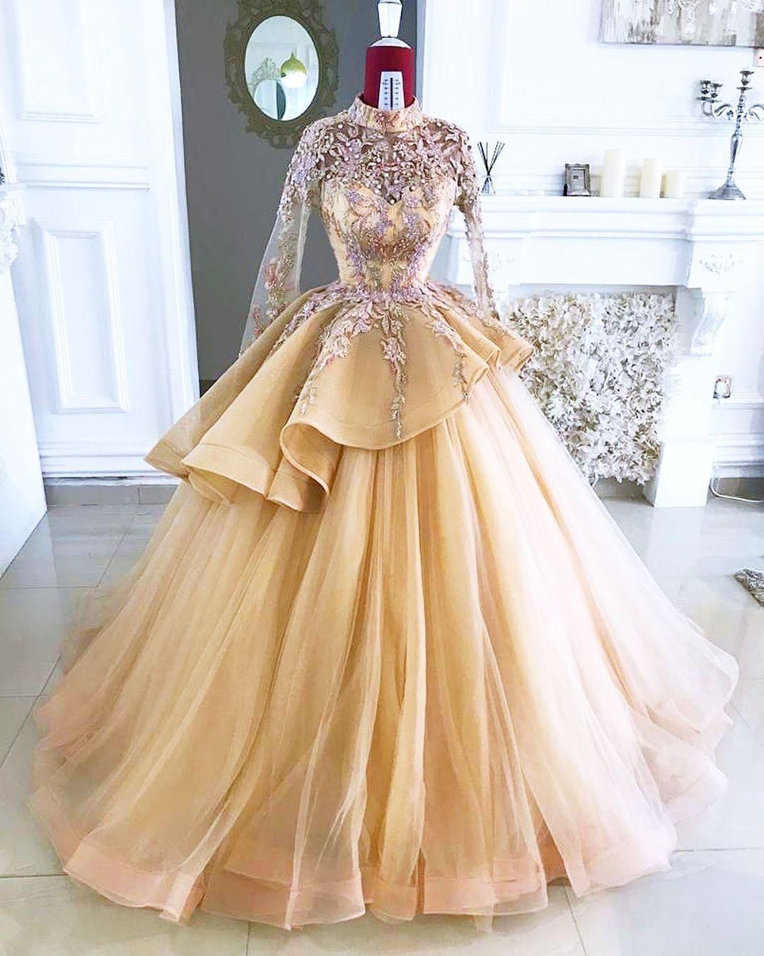 Dubai Arabic Gold Quinceanera Dresses Lace Beaded High Neck Peplum Prom Dresses Long Sleeves Formal Party Second Reception Gowns From Click Me 153 43 Dhgate Com